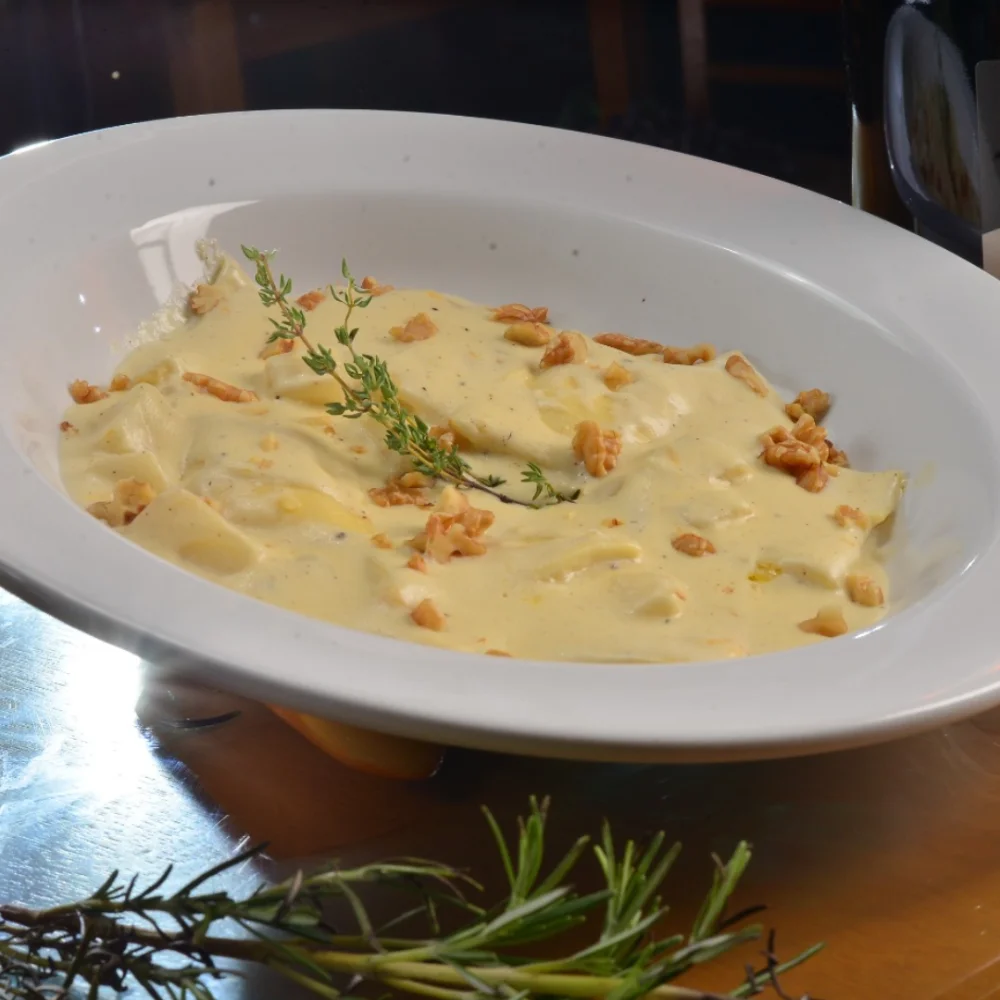 Massa artesanal recheada de queijo brie, nozes e damasco, salteado na manteiga com pera flambado na vodka e creme de parmesão.
