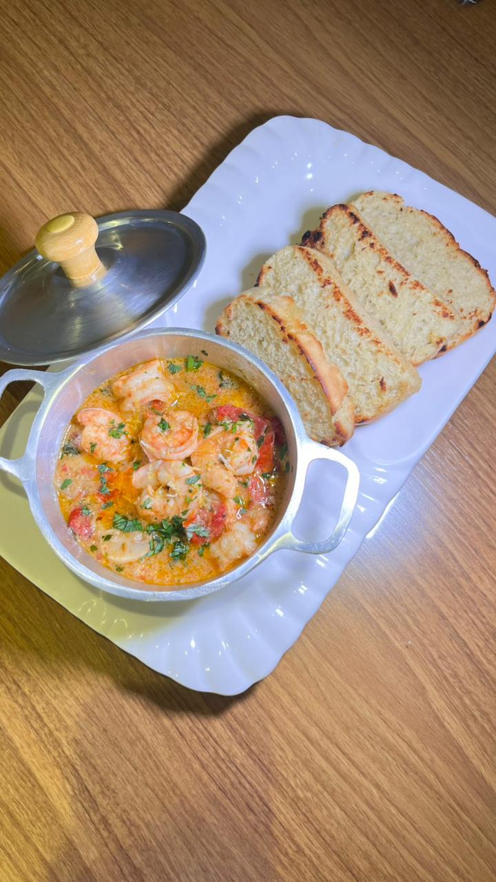 Camarões em molho da casa, com alho confitado e ervas finas, servidos com focaccia artesanal.